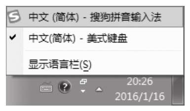 第1步 单击语言栏中的美式键盘图标,在弹出的快捷菜单中选择中文输入法,这里选择【中文(简体)搜狗拼音输入法】选项,如下图所示。