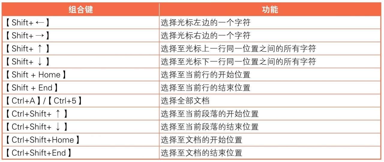 在不使用鼠标的情况下,可以利用键盘上的组合键来选择文本。使用键盘选择文本时,需先将插入点移动到将选文本的开始位置,然后按相关的组合键即可,如下表所示。