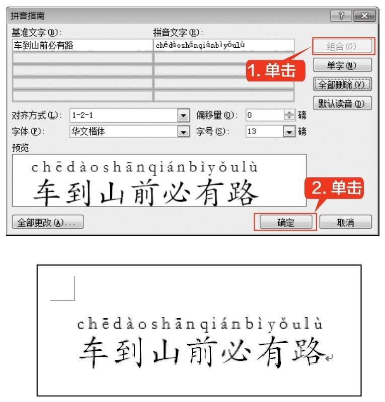 第2步 在弹出的【拼音指南】对话框中单击【组合】按钮,把汉字组合成一行,单击【确定】按钮,即可为汉字添加上拼音,如下图所示。