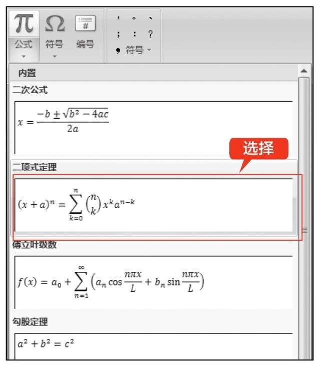 的下拉按钮,在弹出的下拉列表中选择【二项式定理】选项,如下图所示。