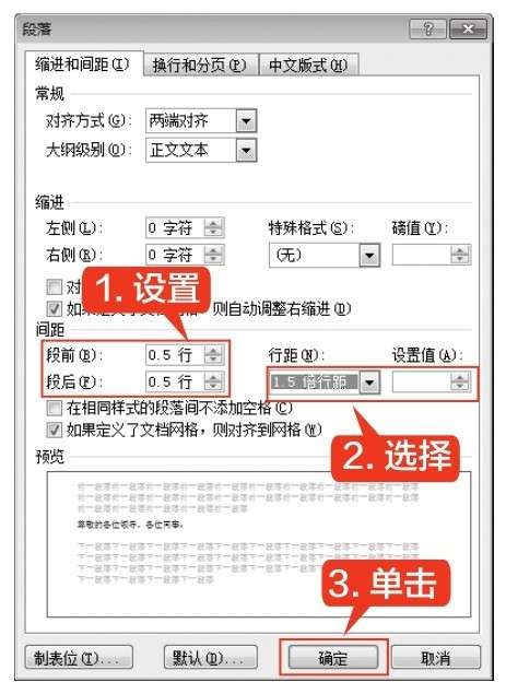 第2步 在弹出的【段落】对话框中选择【缩进和间距】选项卡,在【间距】栏中分别设置【段前】和【段后】为【0.5行】,在【行距】下拉列表中选择【1.5倍行距】选项,单击【确定】按钮,如下图所示。