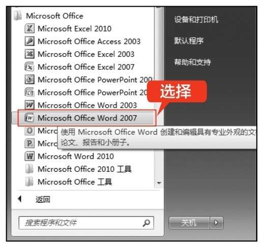 第1步 单击操作系统任务栏中的【开始】按钮,在弹出的菜单中选择【所有程序】→【Microsoft Office】 →【Microsoft Office Word 2007】选项,如下图所示。