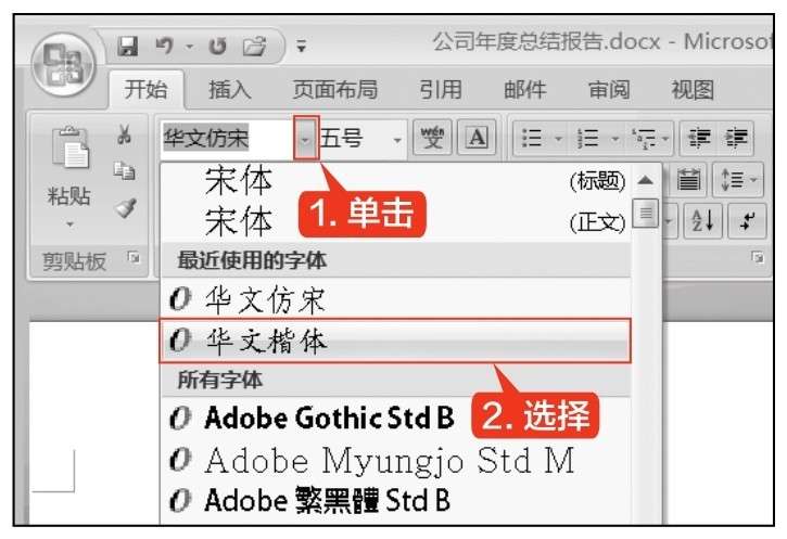 第3步 即可看到设置字体和字号后的文本效果。选中第2行文本,单击【开始】选项卡下【字体】组中的【字体】按钮的下拉按钮,在弹出的下拉列表中选择【华文楷体】选项,如下图所示。