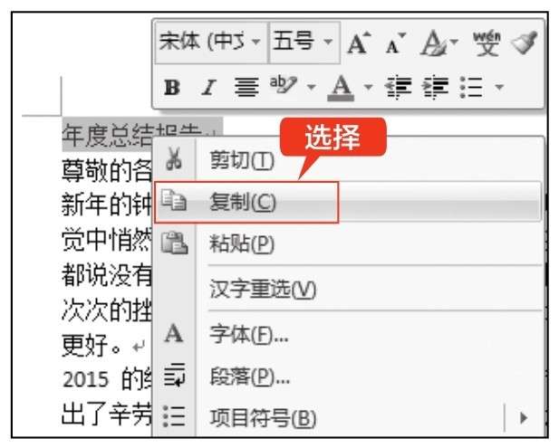 第1步 选择文档中需要复制的文本并右击,在弹出的快捷菜单中选择【复制】选项,如下图所示。