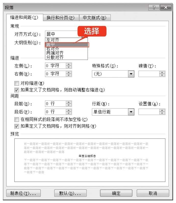 第2步 在弹出的【段落】对话框中选择【缩进和间距】选项卡,在【常规】栏中单击【对齐方式】文本框右侧的下拉按钮,在弹出的下拉列表中选择【居中】选项,如下图所示。