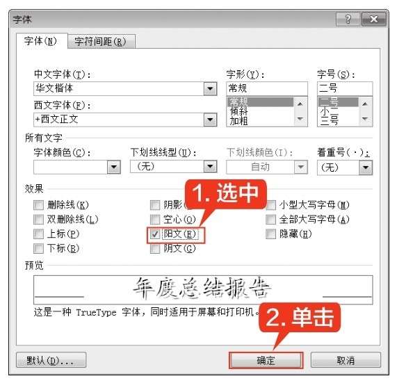 第2步 在弹出的【字体】对话框中选择【字体】选项卡,选中【效果】栏中的【阳文】复选框,单击【确定】按钮,如下图所示。