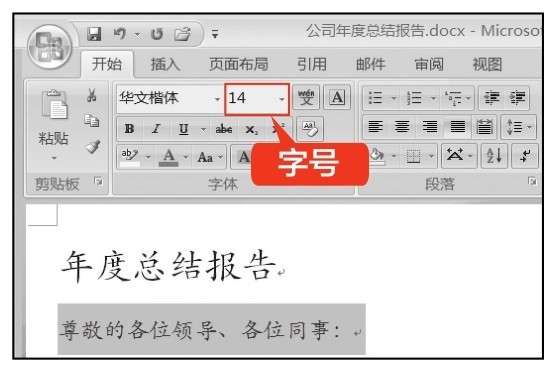 第4步 即可完成字体的设置。单击【开始】选项卡下【字体】组中的【字号】按钮的下拉按钮,在弹出的下拉列表中选择【14】选项,文本效果如下图所示。