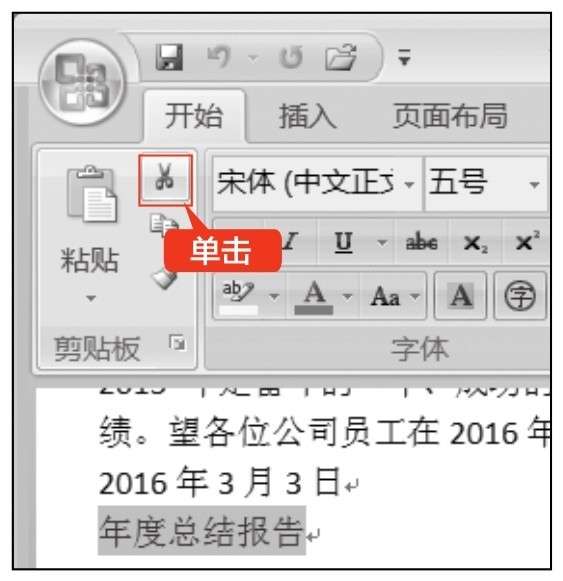选择文档中需要剪切的文本,单击【开始】选项卡下【剪贴板】组中的【剪切】按钮
