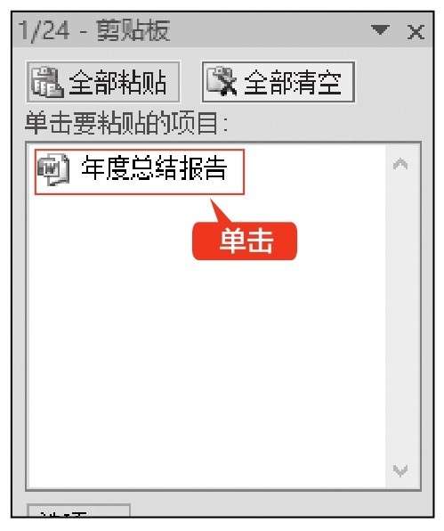 按钮,在打开的【剪贴板】窗格中即可看到复制的内容,将鼠标光标定位至要粘贴到的位置,单击剪贴板中要粘贴的内容,如下图所示。