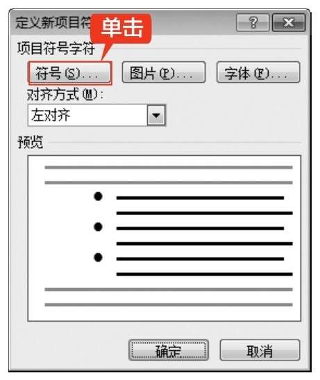 第2步 在弹出的【定义新项目符号】对话框中单击【项目符号字符】栏中的【符号】按钮,如下图所示。