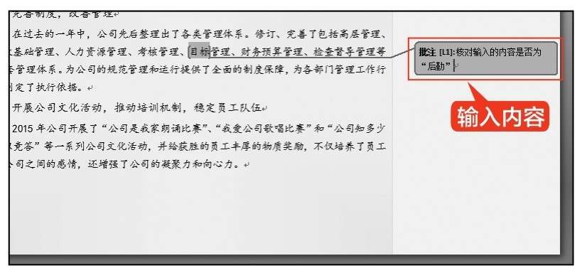 第2步 在文档右侧出现的批注框中输入批注的内容即可,如下图所示。