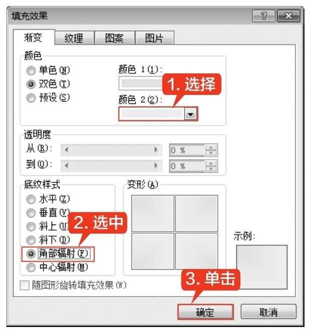 第3步 单击【颜色2】下拉列表框,在弹出的列表中选择一种颜色,这里选择【白色,背景1,深色5%】选项。在【底纹样式】栏中选中【角部辐射】单选按钮,然后单击【确定】按钮,如下图所示。