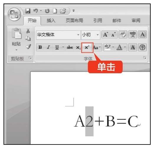 在文档中输入一段文字,例如,这里输入“A2+B=C”,选择字符中的数字“2”,单击【开始】选项卡下【字体】组中的【上标】按钮