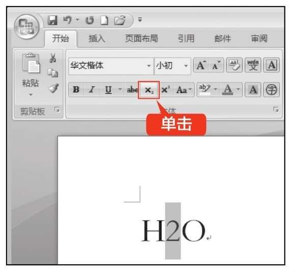 在文档中输入“H2O”字样,选择字符中的数字“2”,单击【开始】选项卡下【字体】组中的【下标】按钮