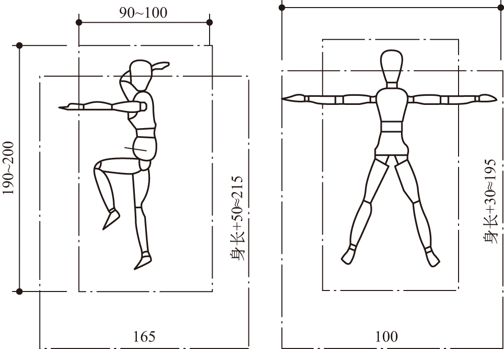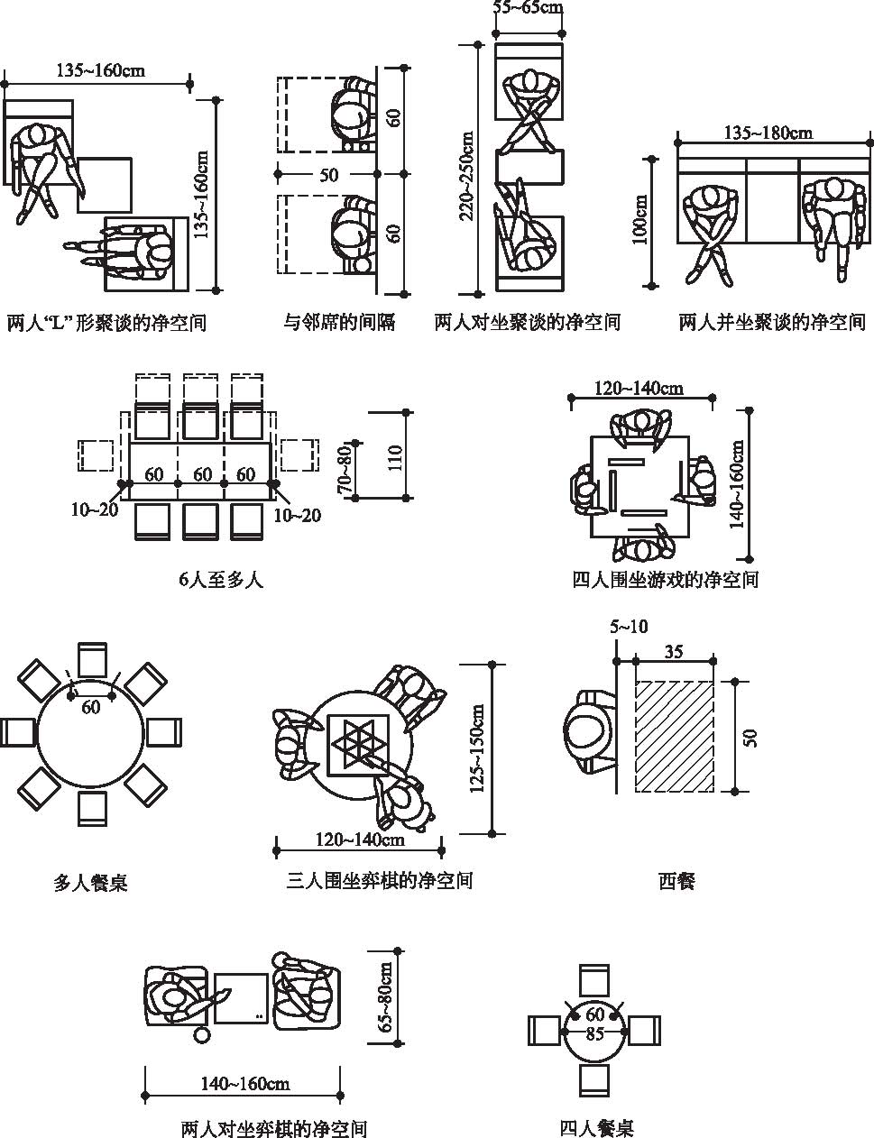 影响场所空间大小、形状的因素很多,但是,最主要的因素还是人的活动范围及设施的数量和尺寸。因此,在确定场所空间范围时,必须搞清楚使用这个场所空间的人数,每个人需要多大的活动面积,空间内有哪些设施及这些设施和设备需要占用多少面积等,如图1.2和图1.3所示。