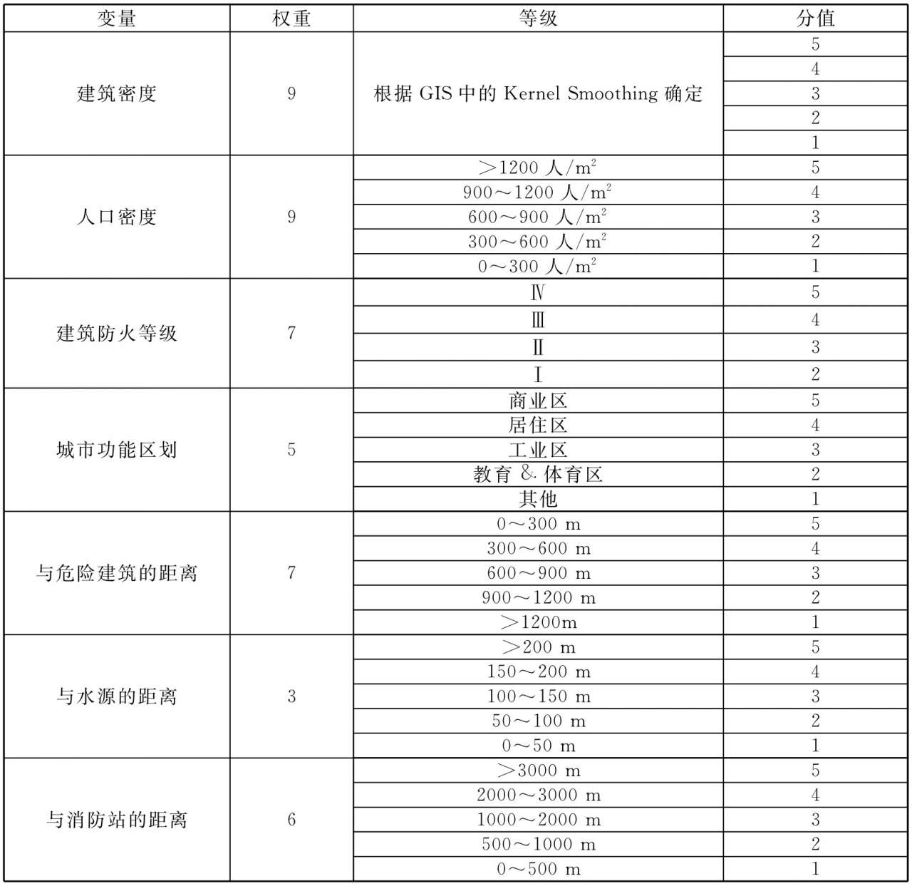 根据城市火灾风险分析指标体系,可得城市火灾风险值,并确定火灾风险等级,如表2-2所示。所有过程均在GIS中实现,其中建筑和人口密度、建筑防火等级、城市功能区划使用GIS中的Kernel Smoothing实现;与危险建筑的距离、与水源的距离和与消防站的距离使用GIS中的Euclidean Distance实现。