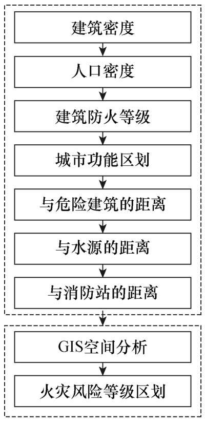 选取相应的评价指标,并对各指标人为赋予权重值,最后在GIS中对各影响因素进行叠加,得到城市火灾风险等级图。城市火灾风险分析流程,如图2-1所示。