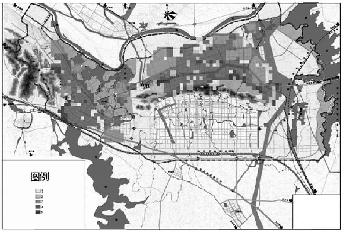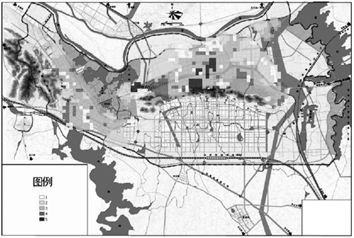 城市功能区划如图2-5所示,颜色越深的区域,分值越大。各区域依分值从大到小分别为商业区、居住区、工业区、教育与体育区和其他用途的区域。