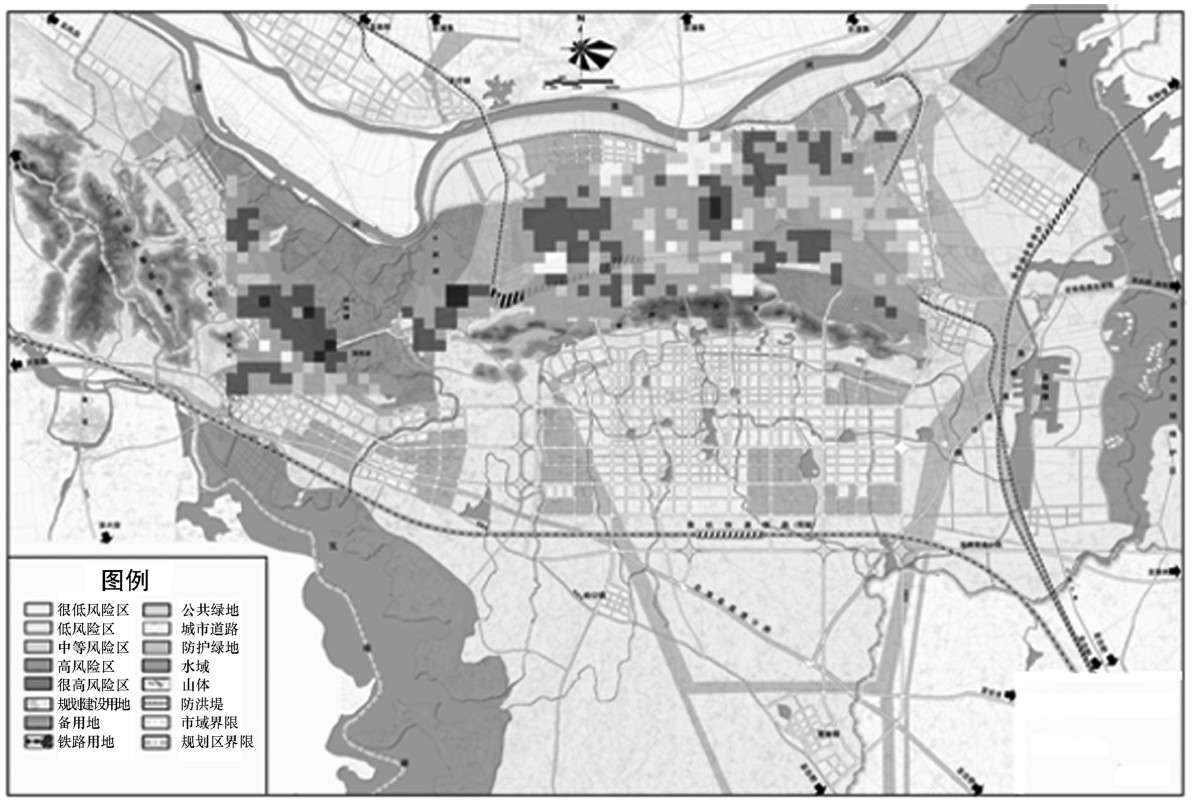 根据火灾风险指标体系及各指标的取值,通过GIS中的图层叠加,可得到规划区域的火灾现状风险等级图,如图2-14所示。颜色越深的区域分值越大,其火灾风险等级也越高。可以看出,建筑和人口密度大、危险源附近、离消防站和水源远的地方的火灾风险较大。