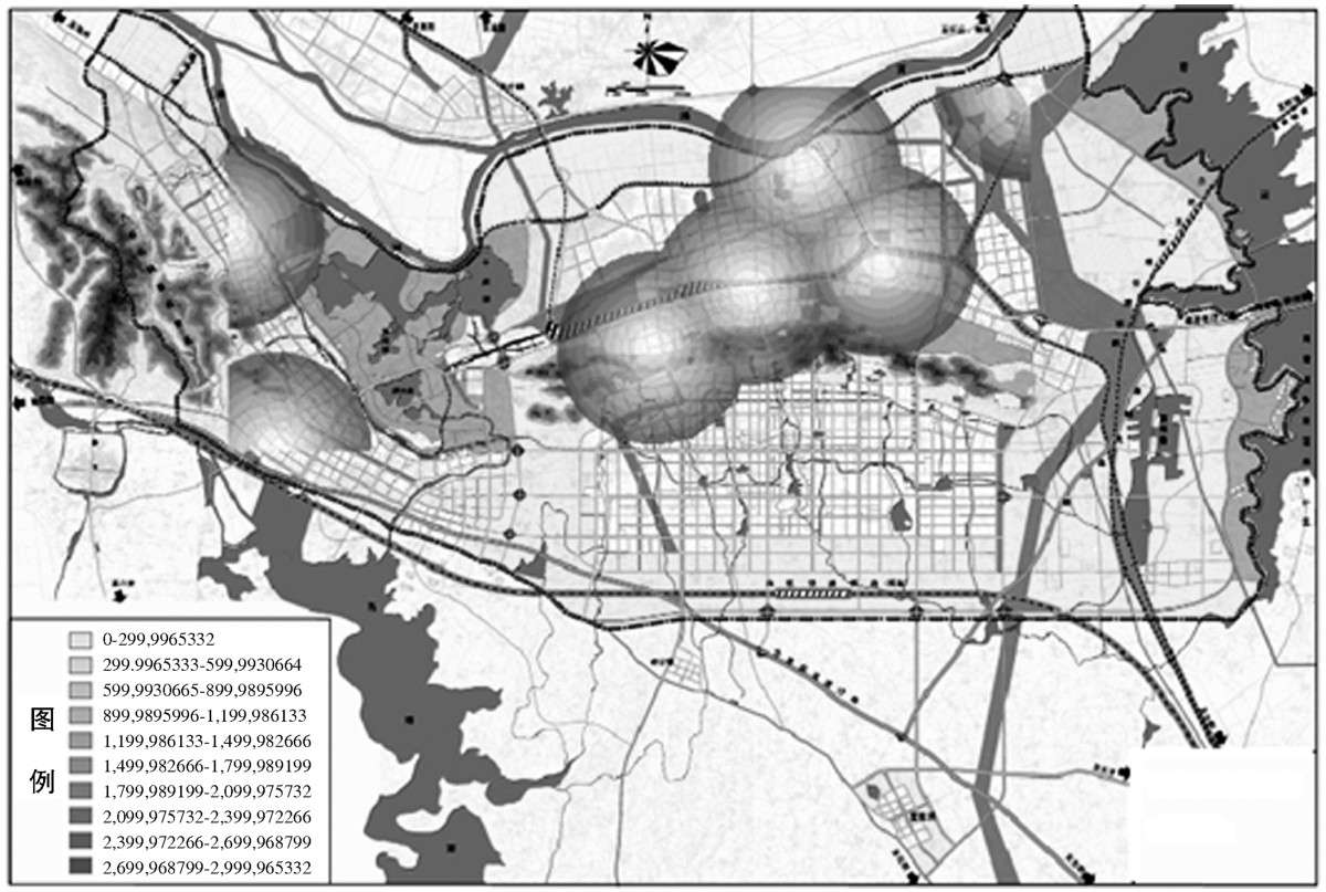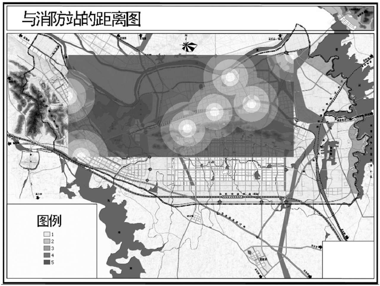 将与消防站的距离分成5个等级。颜色越深的区域,离消防站的距离越远,如图2-10所示。颜色越深的区域分值越大,离消防站的距离越远,其火灾危险也越大。