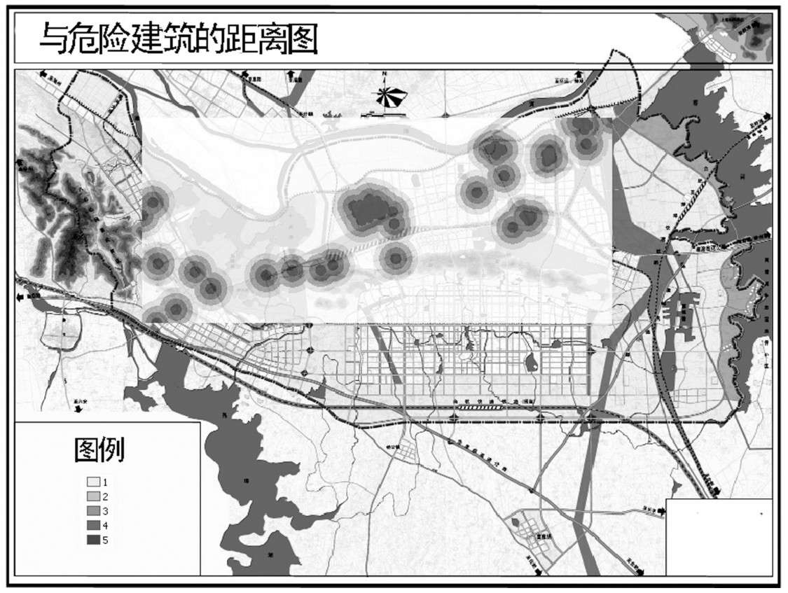 将与危险建筑的距离分成5个等级,颜色越深的区域离危险建筑的距离越近。如图2-7所示,颜色越深的区域分值越大,与区域离危险建筑的距离越近,其火灾危险也越大。