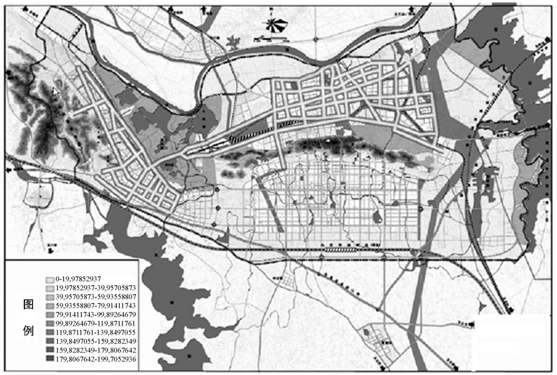 建筑密度根据统计资料所得,如图2-2所示,颜色越深的区域,分值越大,建筑密度越大。可以看出,深色区域所代表的棚户区建筑密度最大。