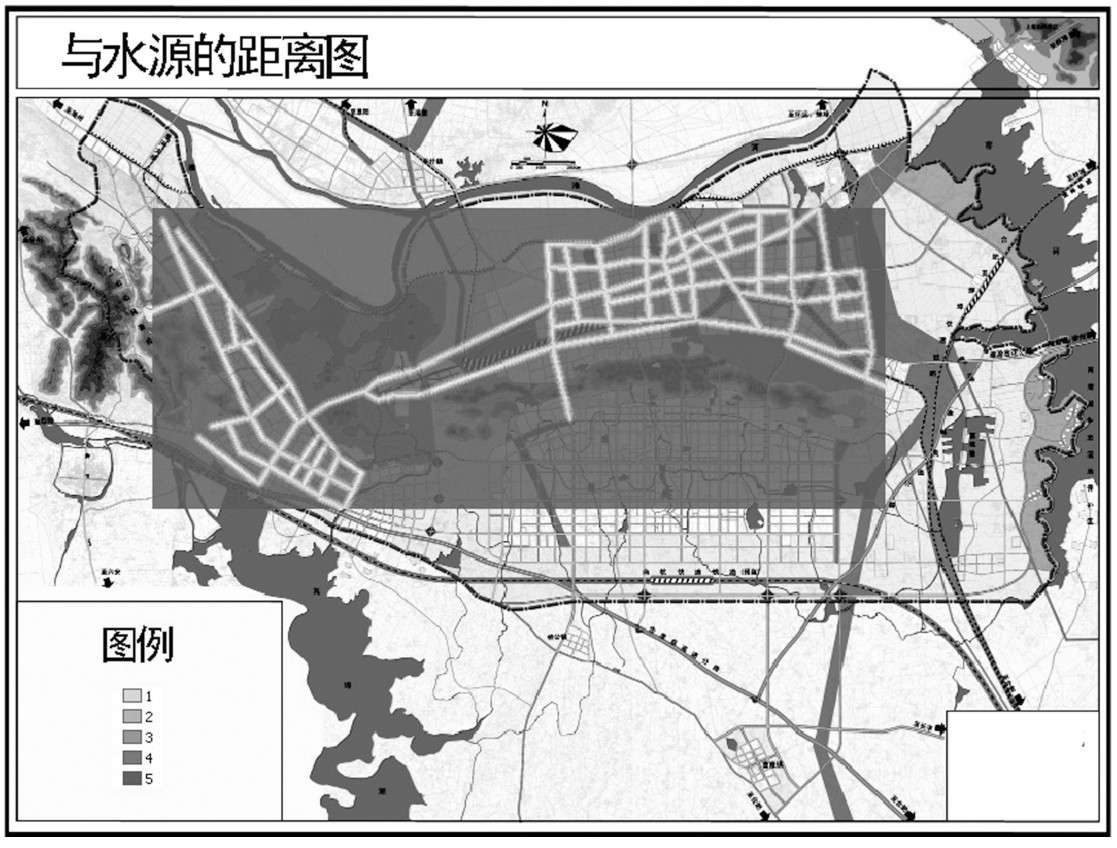 将与水源的距离分成5个等级。颜色越深的区域分值越大,离水源的距离越远,其火灾危险也越大。如图2-13所示。