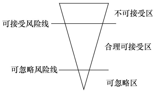 在风险的可接受方面,合理可接受水平(As Low As Reasonable Practicable, ALARP)的概念被越来越多地提及。ALARP准则包含两条风险分界线,上面一条称为可接受风险线,下面一条为可忽略风险线。这两条风险分界线将风险分为三个区域:不可接受区、合理可接受区(ALARP区)和可忽略区,如图1-2所示。若风险处于不可接受区,无论它带来的收益有多大,都必须采取措施来减少风险;在可忽略区,风险处于很低水平,可以忽略不计;这两种极端情况之间的区域就是ALARP区。对此区域,要在实际情况下通过风险评估,采取必要的风险减缓措施尽量减少风险。