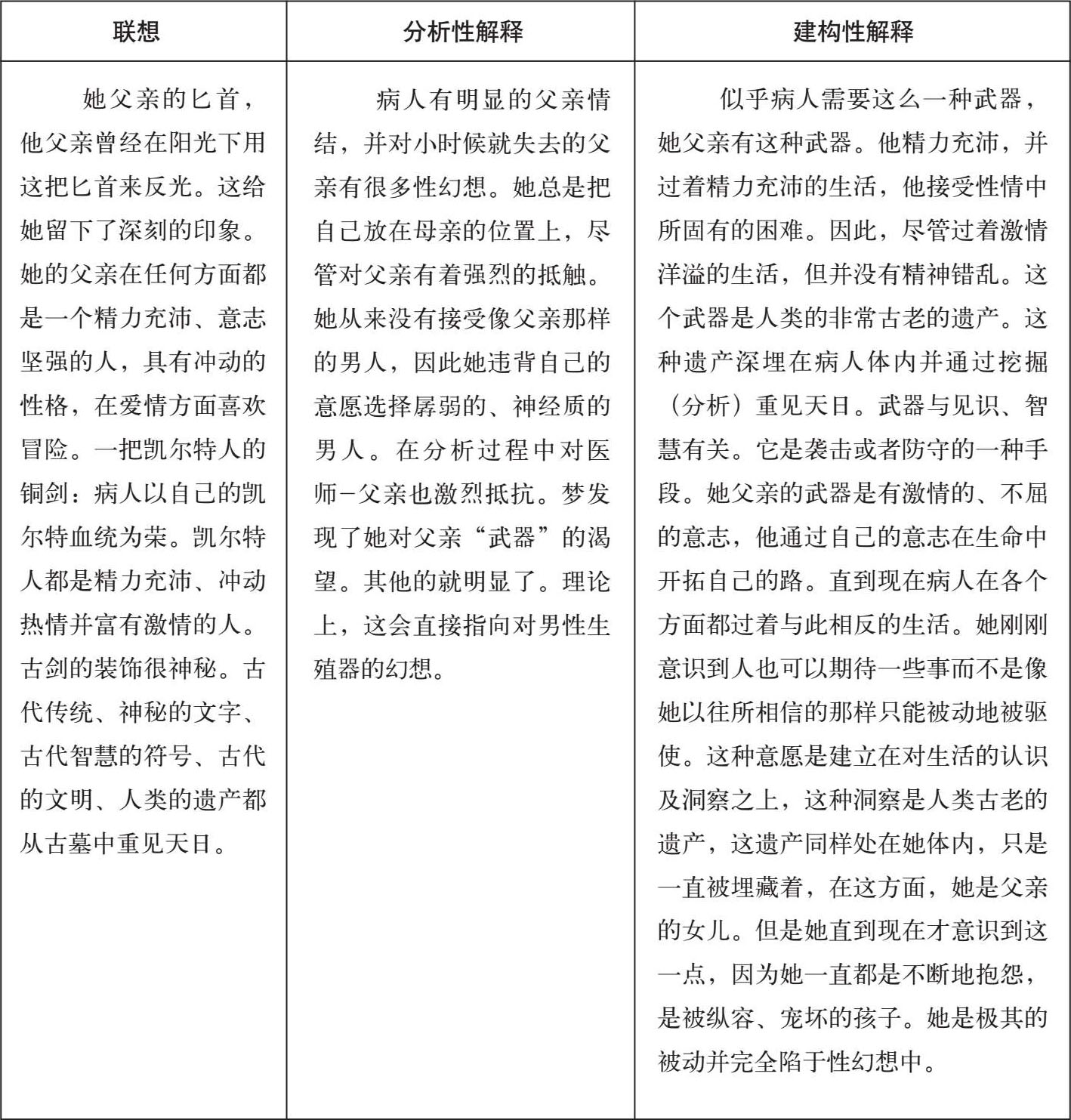 在这个例子中,分析师不需要任何辅助的类推。病人的联想提供了所有必需的东西。有人可能会反对说,这种释梦的方法中有暗示。但是它忽视了这样一个事实,如果没有内在的接受意愿,暗示是绝对不会被接受的,即使是经过激烈的抵抗之后被接受了,它也会即刻再次消失。一种暗示不论被接受多长时间,都假定了明确的心理接受的愿望,而这愿望只是由于所谓的暗示的推动才开始发挥作用。因此,这种反对意见没有价值,它给予暗示一种它绝对没有的魔力。否则的话,暗示疗法就会有很好的效果,并使分析过程成为非常多余的。但事情远非如此。此外,对暗示进行指责没有考虑到这样一个事实,病人的联想指向了这把剑的文化意义。