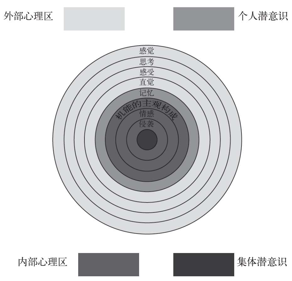 图表中的下一层圆环代表的是同各种机能相关的有意识的自我情结。在内部心理中,你首先注意到的是记忆。记忆作为一种仍能受意志控制的机能,处于你的自我情结控制之下。之后,我们遇到的是机能的主观构成。它们不能严格地受意志引导,但是仍能在强度上被意志力抑制、排斥和增进。这些构成不再如记忆般可加控制,尽管如你所知,记忆也颇有些狡诈。接下来我们见到的是只有竭尽全力才能控制的东西:情感和侵袭。对于它们,你所能够做的就是抑制。为避免发作,你不得不紧握双拳,因为它们比你的自我情结更强大。