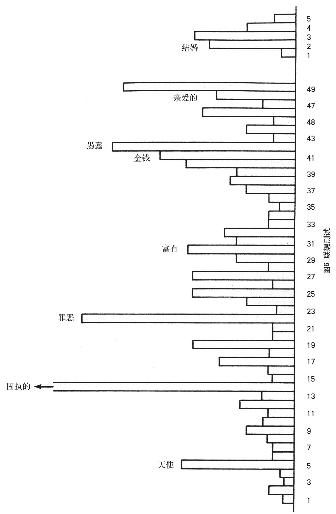 但是偶尔你也会遇到真实的悲剧。图6所描述的是关于一名年龄在30岁左右的女人的病例的情况。她在诊所里被诊断为患有一种抑郁性精神分裂症。相对而言,这个诊断是非常严重的。我监护了她,并对她有一种特殊的情感。我对这种严重的诊断感到不能认同,因为那时精神分裂症对我来说,已经是相对的了。我认为,相对来看我们都是疯子,但是这个女人有些特殊,我不能接受将这个诊断作为最终定论。那时人们所知非常有限。当然,我了解了她的既往病史,但这些对了解她的病毫无帮助。因此,我让她做了联想测试,并最终获得了非常奇怪的发现。第一次紊乱是被词语“天使”引起的,而对词语“固执的”完全没有反应。之后引起反应的是“罪恶”、“富有”、“金钱”、“愚蠢”、“亲爱的”和“结婚”。那么,这个女人就是一位富裕男士的妻子,生活优越而且非常快乐。我询问了她的丈夫,他能告诉我的唯一一件事,和她所说的一样,那就是:这种抑郁是从她年纪最大的孩子——一名4岁的小女孩——死后两个月开始的。此外再也找不到任何关于这个病例的其他病因。联想测试呈现给我一系列非常令人困惑的反应,使我无法把它们整合起来。你常常会陷入这样的困境,当你再没有其他有助于进行诊断的常规手段时尤其如此。那么,你就要先向受测者询问一些与核心问题没有直接关系的语词。如果你直接对最强烈的紊乱进行询问,就很有可能得到错误的答案。所以,从相对温和的语词开始,你就有可能得到诚实的回答。我说:“对‘天使’怎么看?这个词对你有什么意味吗?”她回答道:“当然,那是我已经失去的孩子。”之后她泪如雨下。待雨过天晴后,我问道:“‘固执的’对你意味着什么呢?”她说:“没有任何意味。”但是我说道:“在这个词上出现了很大的紊乱,这表明存在一些和这个词相关联的东西。”但我无法看透。我从词语“罪恶”着手,还是一无所获。对此她存在着一种非常强烈的消极反应,表明她拒绝回答。我改从“蓝色”着手,她说道:“那是我已经失去的孩子的眼睛。”我说:“它们给你留下了特殊的印象吗?”她说:“当然了。孩子出生的时候,它们是那么美妙的蓝色。”我注意到她脸上的表情,说道:“你为什么悲伤呢?”她回答道:“哦,她并没有我丈夫的眼睛啊。”最后,我了解到,那个孩子曾有一双她前恋人的眼睛。我说道:“关于那个男人,有什么让你伤心的吗?”最终,我慢慢地探听出她的整个故事。
