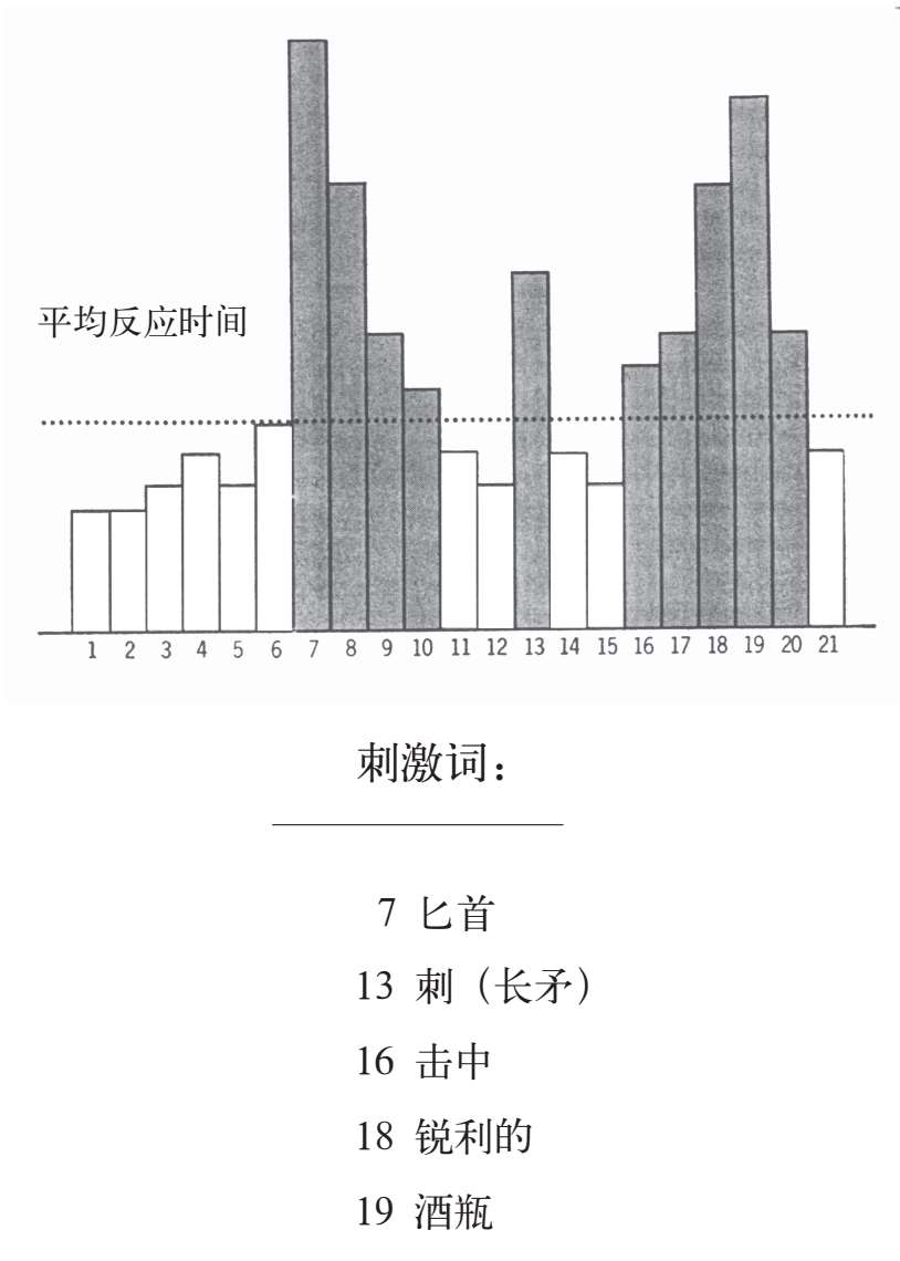 联想测试的结果能够非常规整地用一个图表(图5)阐明。柱状物的高度代表着受测者的实际反应时间。那条水平的虚线代表着反应时间的平均值。不带暗影的柱状物是表示没有紊乱信号的那些反应。带暗影的柱状物表示那些被扰乱了的反应。在反应7、8、9、10中,你会观察到,比如一整个系列的紊乱:在7中的刺激词是临界性的;在受测者没有注意到它的情况下,由于在对该刺激词反应上存在的持续症,所有随后的三个反应时间都被延迟了。受测者完全没有意识到他已经有了情绪。反应13表示了一个孤立的紊乱状态,而16~20的结果则又是一整个系列的紊乱。最强的紊乱出现在18和19中。在这种特别情况下,通过潜意识情绪的强化效应,我们不得不涉及所谓的神经过敏强化:当一个临界的刺激词引起了一种持续的情绪反应时,并且当下一个临界的刺激词碰巧出现在那种持续言语症的范围之内时,那么,如果该刺激词已经出现在一系列无关联想中的话,它就有可能产生一种比原先所预料大得多的影响。这就是所谓持续情绪的强化效应。