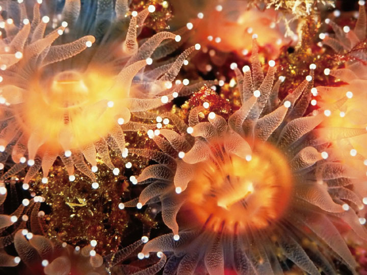 海葵是以水中的动物为生的肉食动物。其放射状的细长的触手伸展开来,在消化腔上方摆动不止,就像一朵朵盛开的葵花