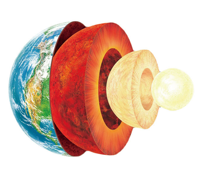 地球解剖图,从外到里依次是地壳圈、地幔圈和地核圈