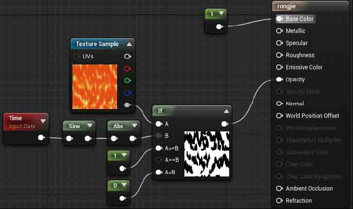 如图2-124所示,是溶解材质的基础节点示意图,包含基本的材质溶解思路。属性值为1的一维常量连接材质Base Color作为物体的基本颜色,添加If条件判断表达式,示例中将纹理表达式的Alpha通道与If表达式的A节点进行连接(纹理尽量使用黑白贴图),连接点使用单通道,不要使用RGB混合通道。添加Time、Sine与Abs三个表达式输出曲线数值,连接If表达式的B节点,目的是在B节点输入随时间变化而不断变化的数值,与A节点纹理表达式的图案数据进行对比。If表达式的条件判断节点添加两个一维常量,分别赋值1与0,需要If表达式根据A与B节点的数值判断结果,输出白色或是黑色。