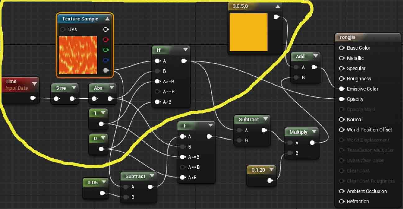 将两个If表达式使用Subtract(减法)表达式连接,相减结果保留了两个If表达式之间0.05的差值纹理,而两个If表达式叠加的纹理部分被抹去了。就像两个在赛跑的人,他们跑过的路程全部抹去,只保留两人之间的距离。这个0.05的常量数值,就是两人间的距离。常量数值是可以自行修改的,这个常量数值的作用是调整边缘发光带的大小。添加一个乘法表达式,把两个If表达式相减的结果,连接到乘法表达式的A节点,建立一个三维矢量,属性中把它的R、G、B通道数值分别设置为0、1、20,将三维矢量连接到乘法表达式B节点。