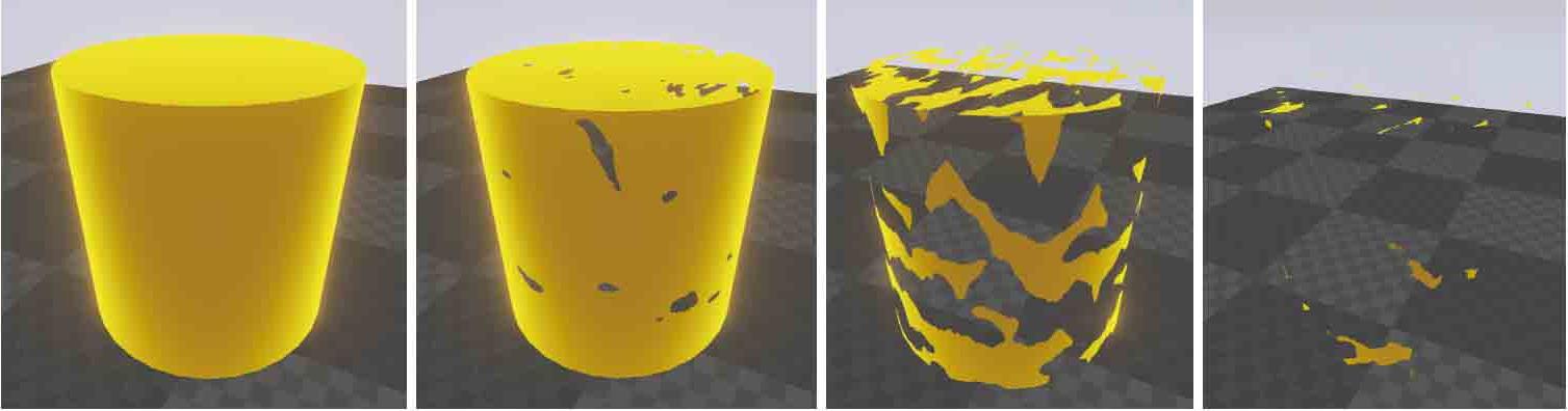 如图2-123所示,游戏特效制作中,物体溶解是一种特殊效果,它不同于传统物体整体的淡入淡出,而是使物体任意部分开始重新组合,或是将完整的物体随机解体。由于溶解材质常用来表现物体被撕碎,因此这种材质效果也可以称为“撕裂材质”。溶解材质原理是对物体Opacity透明通道进行调节,使纹理透明通道最后全部输出白色或全部输出黑色。透明通道中输入黑色代表透明,白色代表不透明。如果材质透明通道中输入数据全部是黑色,这个物体也就完全“消失”了。