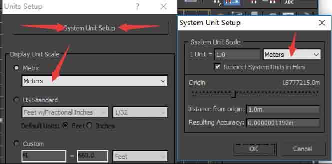 如图3-131所示,导出以前,单击3ds Max菜单栏Customize命令中的Units Setup单位设置。如图3-132所示,在弹出菜单中将Units Setup系统标尺设置为Meters,以米为计算单位。单击对话框中的System Unit Setup按钮设置3ds Max的系统尺寸,在弹出的系统尺寸对话框中将1Unit类型设置为Meters米,单击OK按钮关闭对话框。