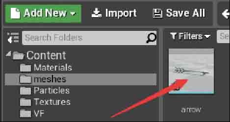 将箭模型FBX文件导入引擎meshes文件夹中,按功能键F2将箭模型重命名为arrow。导入后会在模型旁边自动生成一个材质球,这个材质是箭的默认材质,不过文件归类的位置不对,需要把这个材质球移动到Materials文件夹中。