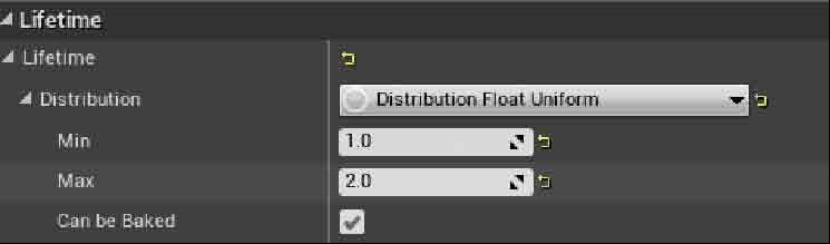 如图3-148所示,打开Lifetime模块,在属性窗口中设置粒子生存时间最小值Min为1,最大值Max为2。