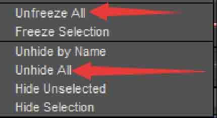 在3ds Max编辑窗口中单击鼠标右键,选中Unhide All命令取消所有隐藏物体,选中Unfreeze All命令取消所有冻结物体,如图3-133所示,操作顺序是先显示所有隐藏物体,再解除物体冻结。