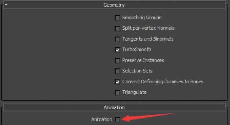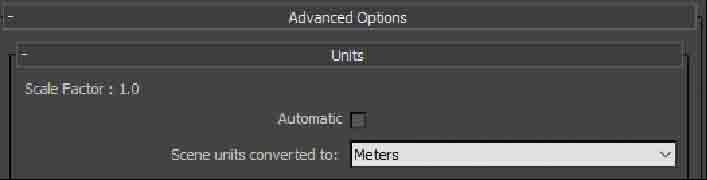 如图3-134所示,单击菜单栏中的File后找到Export,默认导出的是FBX文件,选择好文件存放路径以后,会弹出FBX格式选项框。如图3-135所示,这里需要将Animation栏下面的小勾去掉,我们的这个模型不带有任何动画,所以不需要导出动画。如图3-136所示,打开下面的Advanced Option高级设置下拉菜单,选择Units栏,取消勾选Automatic自动尺寸,在Scene units converted to这一栏选择Meters,将模型尺寸设置以米为单位,单击OK按钮导出文件。