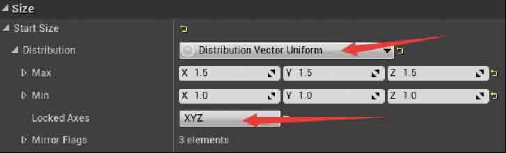如图3-149所示,打开Start Size模块,把Distribution数据输入类型设置为限制数据类型,最大尺寸Max的数值全部设置为1.5,最小尺寸Min的数值全部设置为1,Locked Axes的类型设置为XYZ,锁定X轴、Y轴、Z轴的缩放,使模型等比缩放。