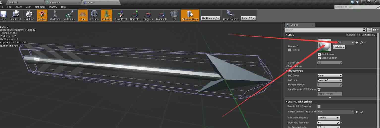 如图3-141所示,回到引擎主界面,在资源浏览器中双击meshes文件夹中arrow的模型图标,打开模型编辑窗口。