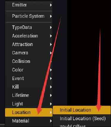 在粒子预览窗口可以看到弓箭呈直线发射,这种直线形态并不理想。我们可以添加新的模块调整发射器形态。在发射器模块区空白处单击鼠标右键,在弹出的模块选择菜单中选择Location命令中的Initial Location模块,给发射器添加发射坐标,如图3-152所示。