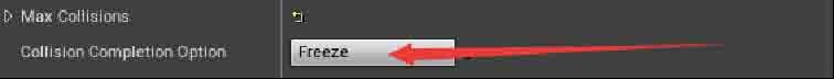 如图3-159所示,将Collision Completion Option类型设置为Freeze。与物体碰撞后的行为类型修改为“冻结”。案例中设置为冻结的意义是使箭矢碰到地面或其他物体以后停止运动,模拟箭矢扎在地面上或者其他物体上。