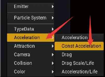 如图3-155所示,在发射器模块区空白的地方单击鼠标右键,在弹出菜单中找到Acceleration命令,选中Const Acceleration,给发射器添加常量加速度模块。