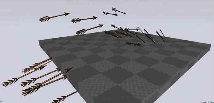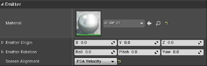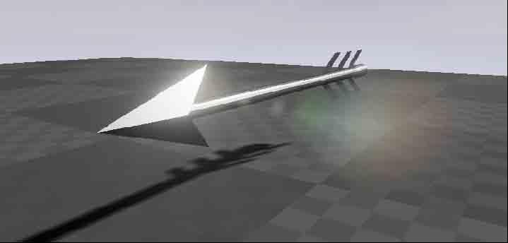 如图3-160所示,扎中物体箭矢就不会再继续飞行了。这是简单的Mesh Data类型粒子的应用。免费版虚幻引擎不支持粒子发射器骨骼动作的模型文件,所以制作粒子Mesh Data类型模型时,请使用不带骨骼动画的单纯模型文件。