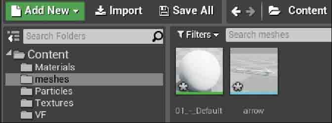 如图3-137所示,打开虚幻引擎,在资源浏览窗口Content根目录下建立名为meshes或者Moxing(模型)的文件夹,用来存放模型文件。值得注意的是,导入的文件千万不要使用中文名,用英文名或拼音都可以,中文名会显示乱码,而且在导入时可能会引起引擎崩溃。