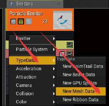 在默认发射器模块区的空白处单击鼠标右键,如图3-145所示,在弹出来的模块菜单栏中选择Type Data命令中的New Mesh Data,将这个发射器定义为模型类型发射器。